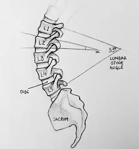 The angle of the lumbar spine is measured from the top of L1 to the bottom of L5. Any angle above 53º or below 39º will apply uneven pressure on the disc, leading to serious issues.